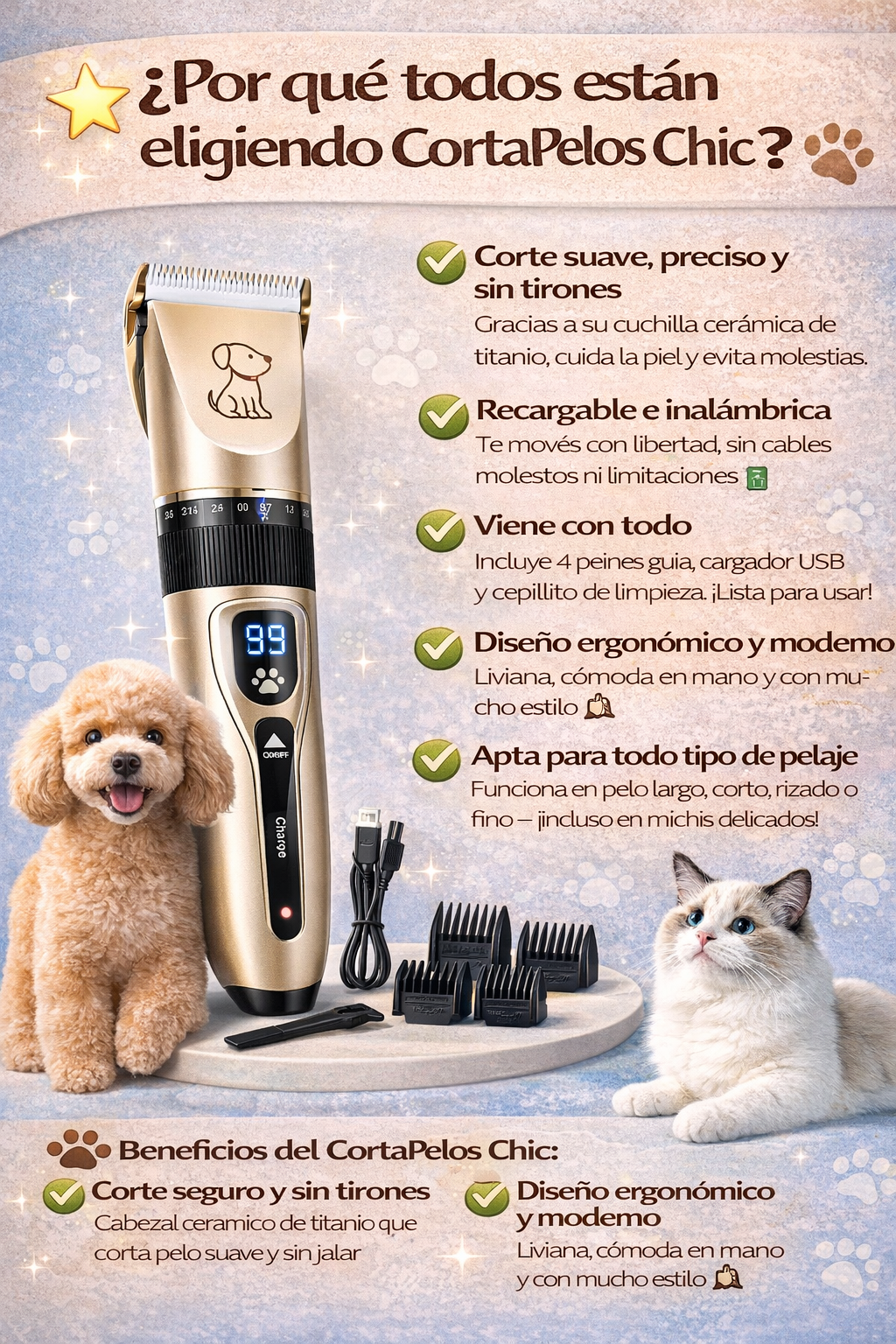 Con CortaPelos Chic, podés hacerle el grooming a tu mascota sin salir de casa. Cómoda, segura y sin cables, esta máquina de corte es ideal para perros y gatos de todo tipo de pelaje. Su cabezal de cerámica evita tirones y cortes bruscos, mientras que sus 5 niveles de ajuste y 4 peines guía te dan precisión y control.